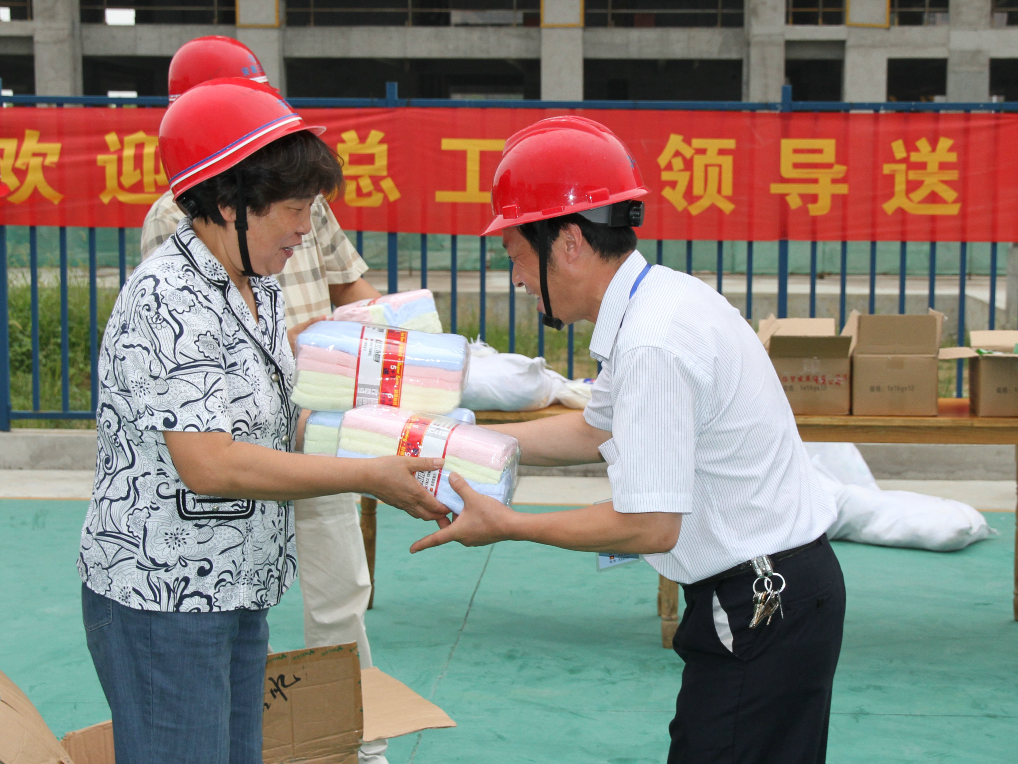 牛和桂同志仔細詢問了工程進展情況、勞動保護和安全保障工作的開展情況,察看了項目部施工現場和辦公生活區,親手將防暑降溫用品送到職工手中,對廣大職工在高溫季節奮戰在一線表示親切的慰問,感謝大家為城市建設做出了巨大貢獻,她指出,建工集團是我省建筑業龍頭企業,各項管理較為規范,項目工程標準化管理起點早,標準高;集團公司始終把關心農民工的工作生活放在首位,廣大農民工群體已成為企業核心職工一部分,她對集團公司項目管理工作取得的成績給予肯定,表示贊許。她希望大家保重身體,注意安全,各級工會組織要協助行政做好高溫季節防暑降溫工作,把職工的安全健康放在首位;要根據項目部實際,因地制宜深入開展“安康杯”競賽活動,做好勞動保護工作,齊心協力,保質保量完成施工生產任務。