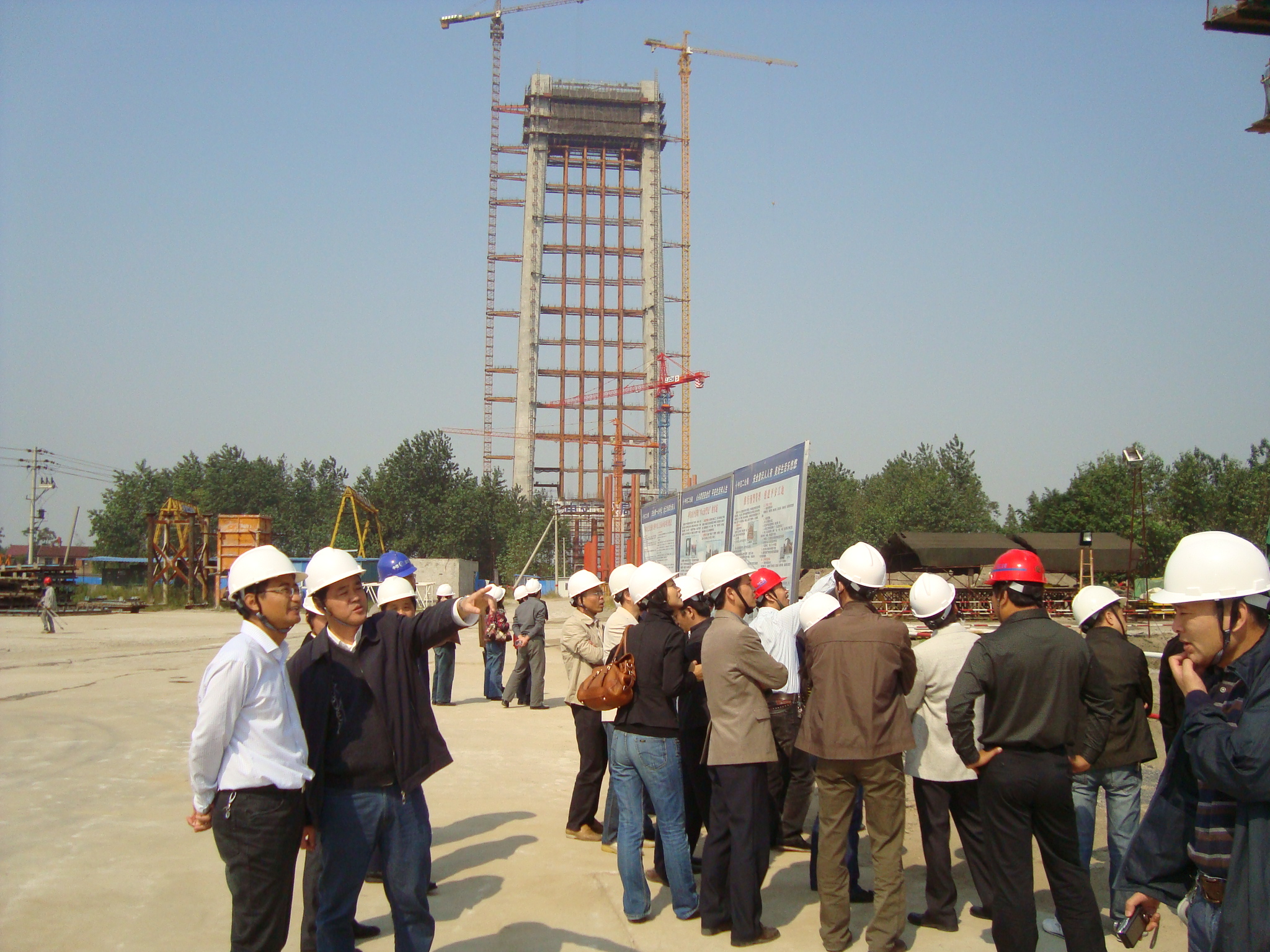 第二天,大橋指揮部領導又親自帶領觀摩團一行參觀了中交二公局等單位承建的馬鞍山長江大橋主橋南北錨碇、南塔和中塔的施工現場,中交二公局現場技術負責人對大橋錨碇基礎、根式沉井基礎、千米級三塔懸索上部結構安裝以及大型水上浮吊吊裝的關鍵技術進行了詳細講解,并回答了大家的提問,現場氣氛熱烈、融洽、活潑。