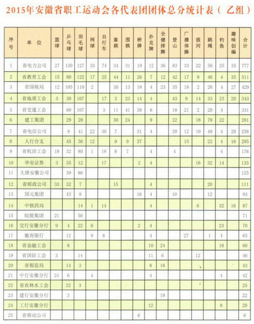 本次運動會是繼1984年舉辦的第二屆全省工人運動會后,安徽省舉辦的又一次全省綜合性職工運動會。省總工會、省體育局共同主辦本屆職工運動會。安徽建工集團共派出88名選手,參加了9個大項、27個小項的比賽。集團工會從確定參賽開始,集中精力,精心組織,詳細制定運動員的選拔和訓練計劃,多次召開工會主席、領隊、教練員和運動員會議進行研究、動員和部署,妥善安排好參賽人員工作與訓練和比賽的時間,所屬單位在訓練場地、后勤服務等方面也予以了關心支持。比賽期間,全體運動員表現出了高度的組織紀律性、良好的精神狀態和高度的團隊精神,經過激烈的比拼,建工集團代表隊共奪得2項冠軍、4項亞軍和4項季軍,總成績在參賽的教育、交通、電信、電力、機械冶金等25個全省行業和省屬、中央駐肥企業中名列第6名,榮獲團體總分三等獎,被全省職工運動會組委會授予優秀組織獎和體育道德風尚獎。通過比賽,建工集團代表隊賽出了水平、賽出了風格,賽出了友誼,展現了安徽建工人良好的精神風貌,充分展示了安徽建工的實力和企業文化,樹立了企業良好的社會形象,擴大了安徽建工的社會影響。