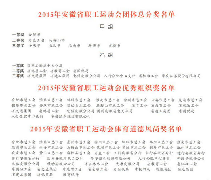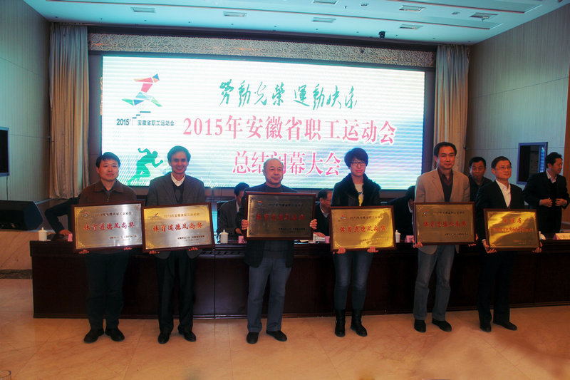 11月16日,“勞動光榮•運動快樂”2015年安徽省職工運動會總結閉幕大會在合肥召開。會議對本屆運動會優勝單位進行表彰。安徽建工集團代表隊經過團結拼搏,取得優異成績,獲得運動會團體總分獎乙組三等獎,并被運動會組委會授予“優秀組織獎”和“體育道德風尚獎”榮譽稱號。