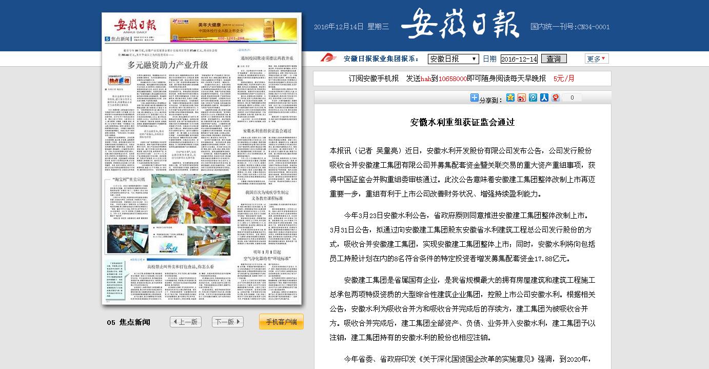 近日,安徽水利開發股份有限公司吸收合并安徽建工集團有限公司并募集配套資金暨關聯交易的重大資產重組事項,獲得中國證監會并購重組委審核通過。此次公告意味著安徽建工集團整體改制上市再邁重要一步,重組有利于上市公司改善財務狀況、增強持續盈利能力。《安徽日報》和安徽省人民政府網站等省內多家媒體對此事項進行了專題報道。