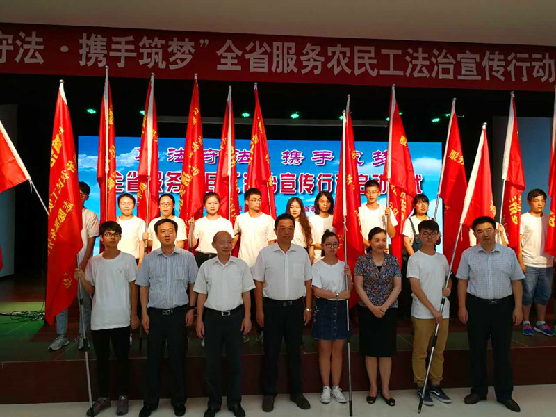 之后,童懷偉主席向法治宣傳服務隊學生代表授旗。啟動儀式后,省職工維權法律顧問團成員進行了首場法治宣講。