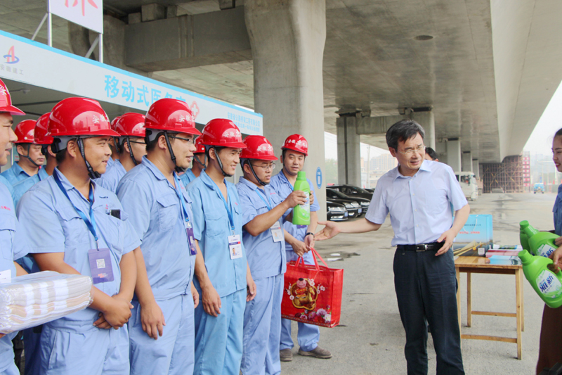 張天培一行與項目部職工一一握手,關切的叮囑要注意防暑降溫、保重身體。張廳長認真聽取了項目負責人關于工程施工情況的匯報,實地參觀了施工現場設置的移動醫務室和移動茶水亭,仔細詢問防暑降溫各項保障工作,對項目部細致、周密、人性化的防暑降溫保障措施,給予了充分肯定。他要求項目部要妥善安排施工計劃,避開高溫時段,合理安排作息時間,確保廣大一線建設者人身安全和健康。