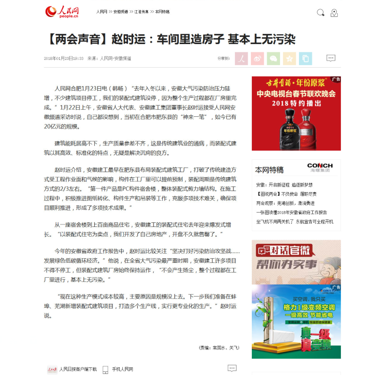 1月22日上午,安徽省第十三屆人民代表大會第一次會議在安徽大劇院隆重開幕。省人大代表、省十三屆人大一次會議計劃和預算審查委員會委員,安徽建工集團董事長、黨委書記趙時運出席會議。當天上午,趙時運代表現場就“堅決打好污染防治攻堅戰、推進裝配式建筑”接受人民網安徽頻道記者采訪。