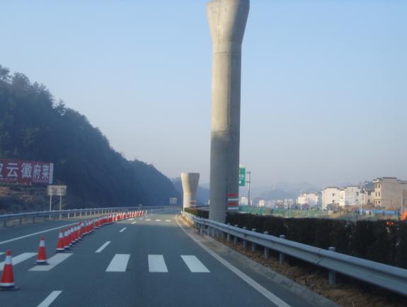 本交叉工程第一階段的施工先后經(jīng)歷了徽杭高速交通安保專家評(píng)審、徽杭高速道路封閉、徽杭高速中分帶拆除與光纜保護(hù)、兩樁基挖孔和鉆孔、中分帶和標(biāo)線改線、樁檢、接樁、立柱、墩帽等施工工序。為確保在規(guī)定的時(shí)間內(nèi)完成施工任務(wù),安徽路港績(jī)黃06標(biāo)項(xiàng)目部通過精心施工、科學(xué)安排工期,許多施工工序安排甚至以小時(shí)計(jì)算。