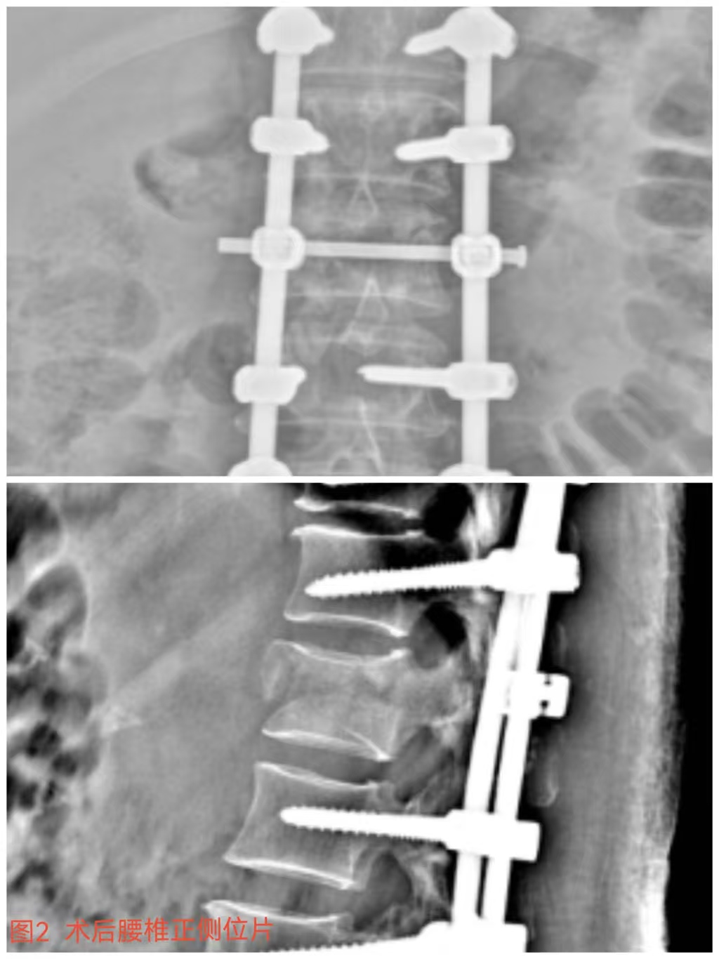 俞德亮副主任醫(yī)師深知病情的嚴(yán)重性,拖得時間越久,脊髓神經(jīng)損傷癥狀越難以恢復(fù),必須把握住早期減壓手術(shù)的關(guān)鍵時間窗,緊急帶領(lǐng)創(chuàng)傷骨科醫(yī)師團隊對該病情進行討論、制定手術(shù)方案,并成功為患者急診行“L1椎體爆裂性骨折伴截癱切開椎板切除+椎管探查減壓+骨折復(fù)位釘棒系統(tǒng)內(nèi)固定術(shù)(圖2)”,該手術(shù)精確解除對脊髓神經(jīng)的壓迫,并通過椎弓根螺釘內(nèi)固定系統(tǒng)對受損的腰椎提供穩(wěn)固的支撐,為后期的康復(fù)創(chuàng)造了良好的條件。