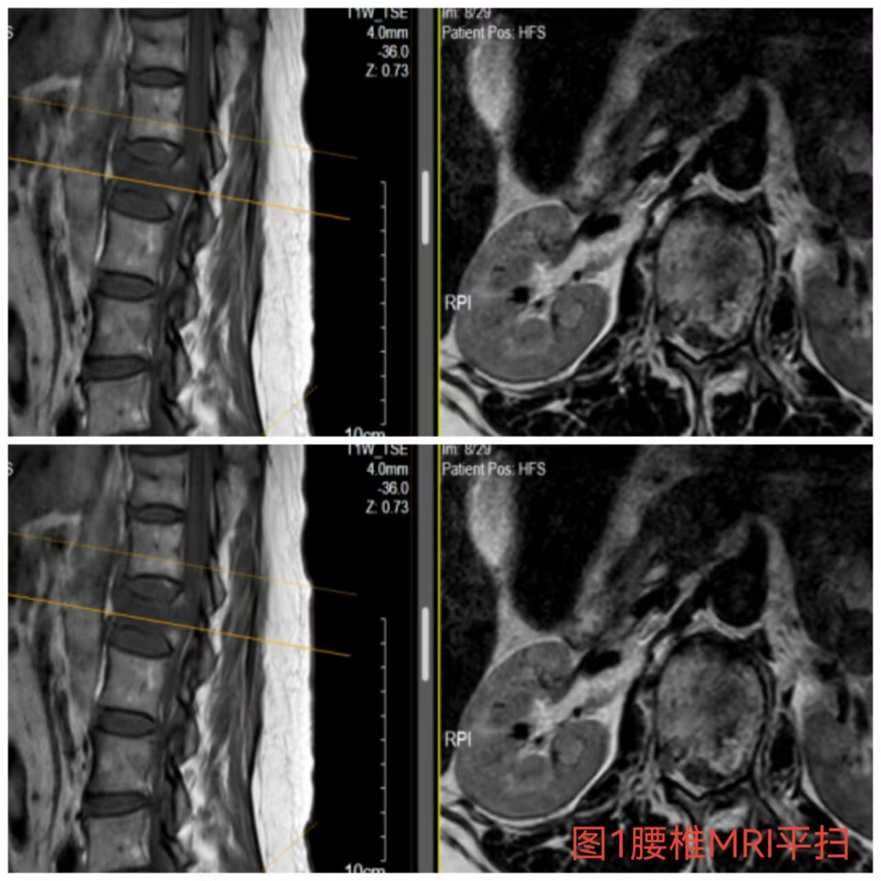 入院時患者躺在床上不能動彈,眼神中透漏著深深的無助,對于她來說這種傷情無疑是沉重的,尤其是腹股溝以下感覺消失、雙下肢肌力0級,這意味著其下肢無法活動及站立,仿佛被命運按下了暫停鍵;與病人及家屬充分溝通病情后,第一時間給予對癥治療,監(jiān)測患者生命體征,行腰椎核磁檢查(圖1)提示:腰1椎體爆裂性骨折,椎體后緣塌陷致骨性椎管狹窄,壓迫脊髓神經(jīng),結(jié)合患者病情及輔助檢查可診斷為:“L1椎體爆裂性骨折伴雙下肢截癱”。