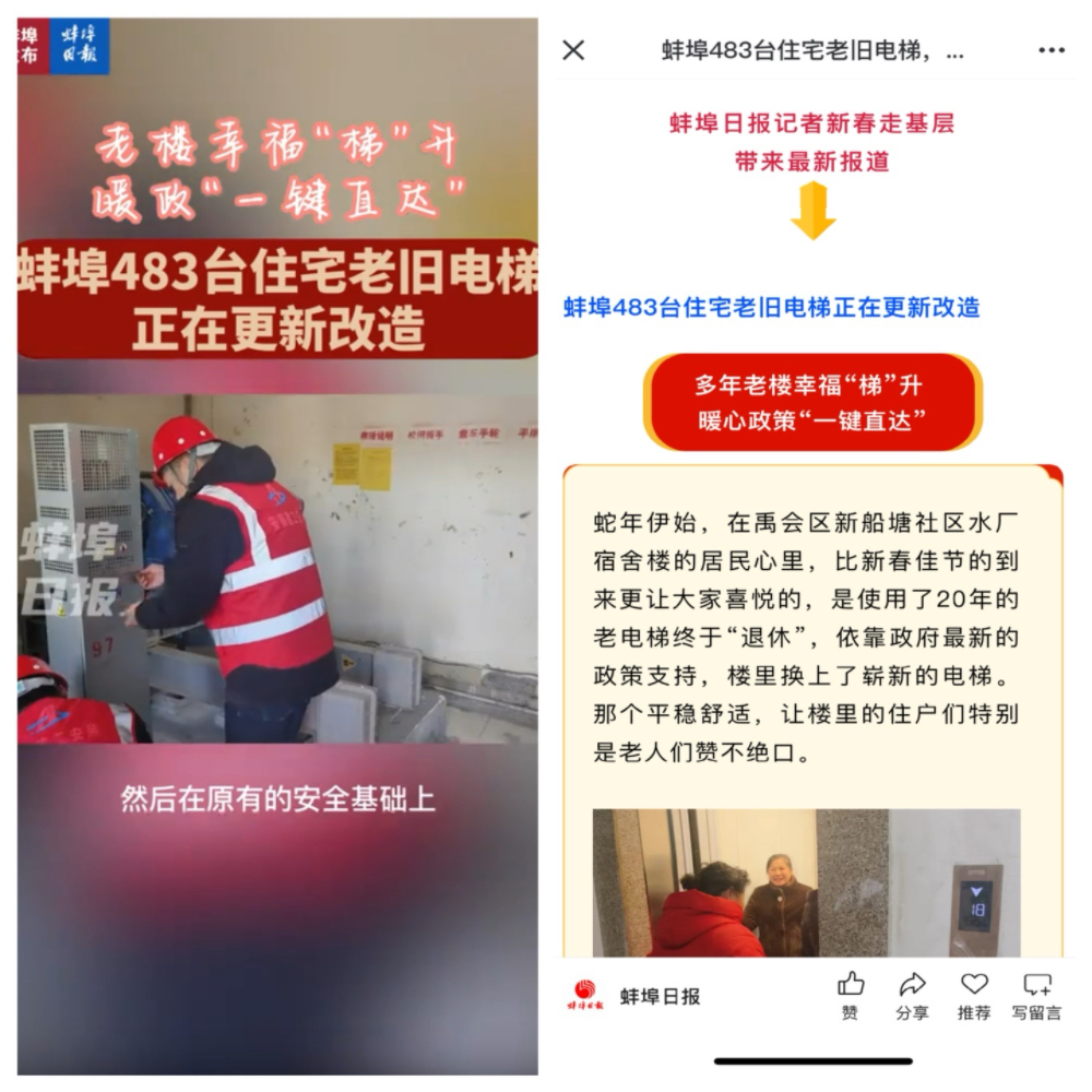 2月9日,蚌埠日報公眾號報道建工安裝蚌埠2024年住宅老舊電梯更新改造項目最新進(jìn)展。