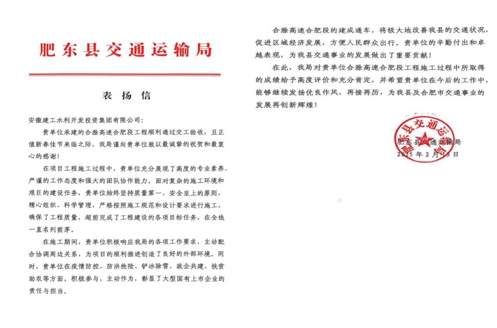 信中指出,合滁高速項目展現出了強大的專業實力和高效的執行能力,在工程質量、進度、安全以及文明施工等方面均表現出色,為肥東縣的交通基礎設施建設做出了重要貢獻,樹立了行業標桿。