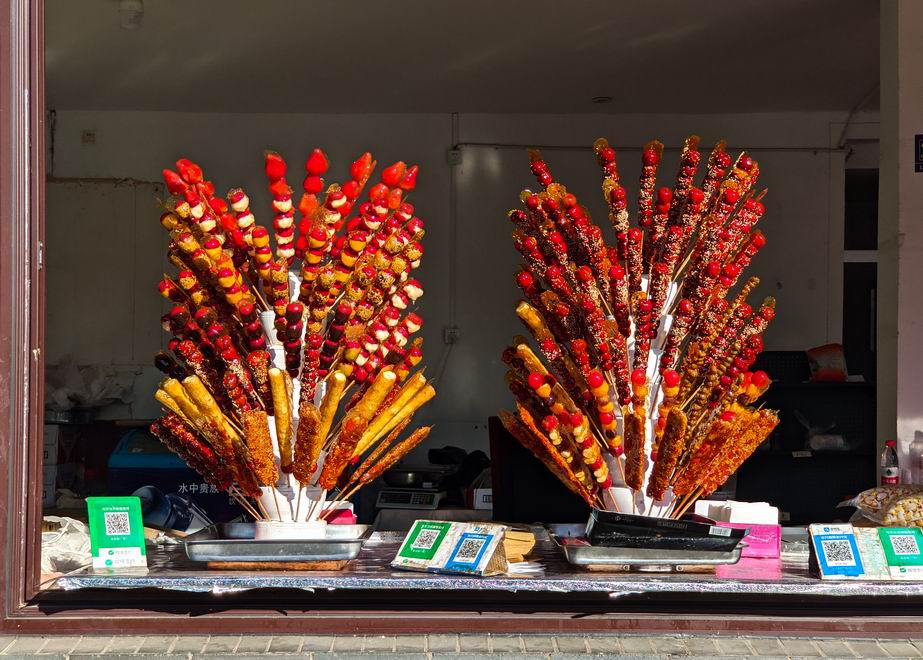 作品簡介:色彩鮮艷的冰糖葫蘆,山楂裹著晶瑩糖衣,搭配著其他食材,整齊地插在架子上。這道傳統美食,不僅有著酸甜的美味,更承載著無數人童年的甜蜜回憶,喚起心底那份純真的快樂。